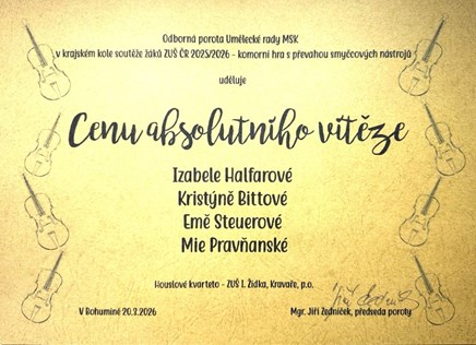 Absolutním vítězem soutěže se stalo houslové kvarteto naší školy ve složení Izabela Halfarová, Kristýna Bittová, Mia Pravňanská a Ema Steuerová. Vedle celkově nejvyššího počtu bodů ze všech kategorií získal soubor i zvláštní cenu poroty.